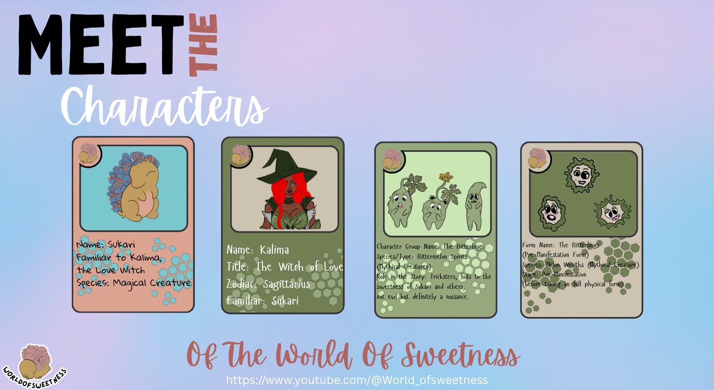 The Bitterlings, inspired by bitter melon, are a quirky group of magical troublemakers. This dynamic band—consisting of a fierce female, two mischievous males, and a toddler—brings whimsy and humor to every situation. Their spiritual forms, resembling sliced bitter melons, embody their creative, magical essence, adding a touch of chaotic art to our serene world.