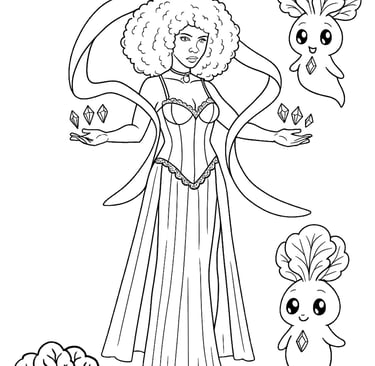 Step into the serene and magical world of Zoloba, the Keeper of Gaia. As the eldest of the Earth Witches, Zoloba embodies the tranquil beauty of nature and the creative forces of the planet. Her flowing green gown, reminiscent of lush forests, and her majestic afro symbolize her deep connection to Earth. Calm and nurturing, she channels her powers to preserve balance, protect secrets, and breathe life into barren lands.